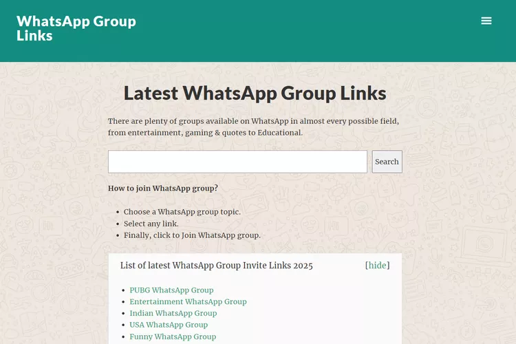 با یک جستجوی ساده در گوگل، نتایجی مانند وبسایت WhatsGroupLink به شما نمایش داده میشود. این نوع وبسایتها، فهرستی بهروز از گروههای واتساپ عمومی را نگهداری میکنند که میتوانید به سادگی به آنها بپیوندید.