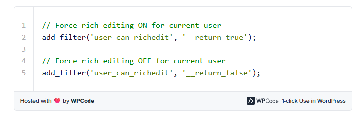 این قطعه کد ویرایشگر دیداری (Visual Editor) حساب کاربری شما را غیرفعال می‌کند و به طور پیش‌فرض، ویرایشگر کد (Code Editor) را برای نوشتن پست‌ها و صفحات در وردپرس فعال می‌سازد.