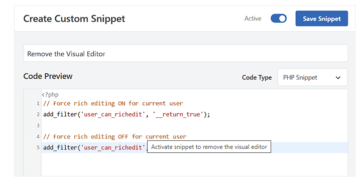 3. پس از آن، یک نام توصیفی برای قطعه کد خود در نظر بگیرید. برای مثال، نامی مانند «غیرفعال کردن ویرایشگر دیداری» به شما کمک می‌کند تا عملکرد کد را به راحتی در آینده تشخیص دهید و مدیریت کنید.