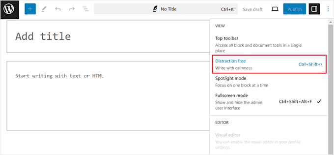 برای فعال کردن این حالت، کافی است یک صفحه یا پست را در ویرایشگر بلوک باز کرده و روی نماد سه نقطه در گوشه سمت راست بالای صفحه کلیک کنید. با این کار یک منوی کشویی باز می‌شود که در آن باید گزینه «بدون مزاحم یا Distraction free» را انتخاب کنید.