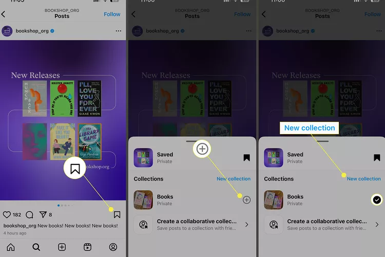 2. پست به صورت خودکار در مجموعه پیشفرض شما با عنوان “All posts“ ذخیره میشود. اگر میخواهید آن را به یک مجموعه مشخص اضافه کنید، بلافاصله روی گزینه “+ (علامت به علاوه)” که در کنار آن ظاهر میشود، ضربه بزنید.