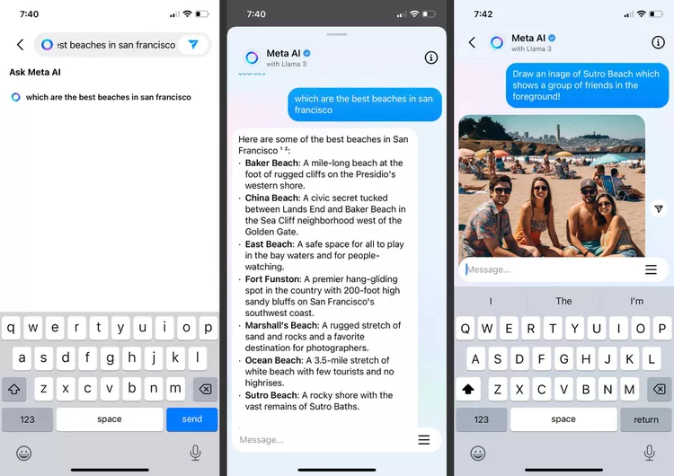 - خلق یک تصویر: در پایان روز، میتوانید روز ساحلی خود را با کلمات کلیدی مثل “تخته موجسواری” یا “درختان نخل” برای هوش مصنوعی توصیف کنید و از آن بخواهید یک تصویر بسازد. در این صورت، هوش مصنوعی متا یک عکس خاطرهانگیز و منحصربهفرد برای کل گروه در چت ایجاد میکند.