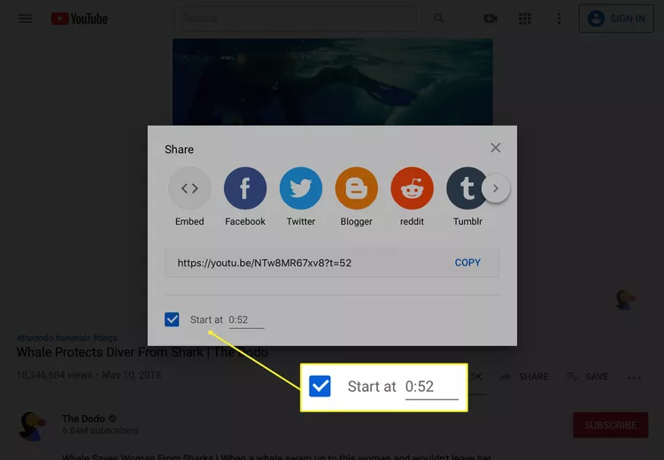 3. زمانی که میخواهید ویدیو آغاز شود را وارد کنید. اگر دقیقاً در همان لحظهای که میخواستید ویدیو آغاز شود، دکمه اشتراکگذاری را فشرده باشید، ممکن است زمان صحیح از پیش درج شده باشد.