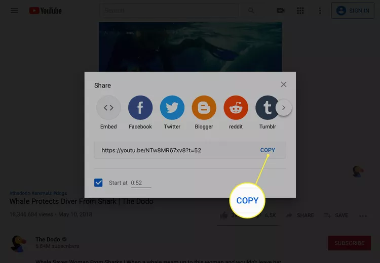 4. برای ذخیره نشانی اینترنتی (URL) با مهر زمانی، روی «کپی» کلیک کنید. خواهید دید که پیوند تغییر کرده و شامل کاراکترهای اضافی است که به یوتیوب نشان میدهد ویدیو در چه زمانی باید آغاز شود (در ادامه توضیحات بیشتری ارائه خواهد شد).